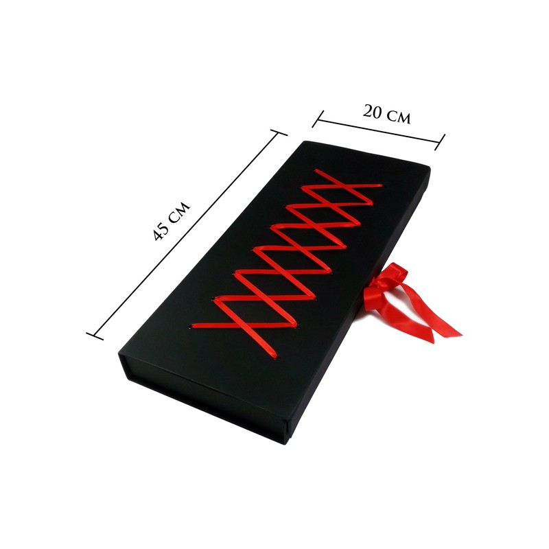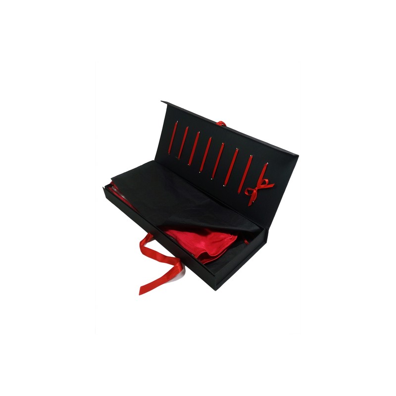 Es un estupendo estuche de cartón forrado en color negro con tapa de imán y lazo rojo, donde poder guardar la lencería.